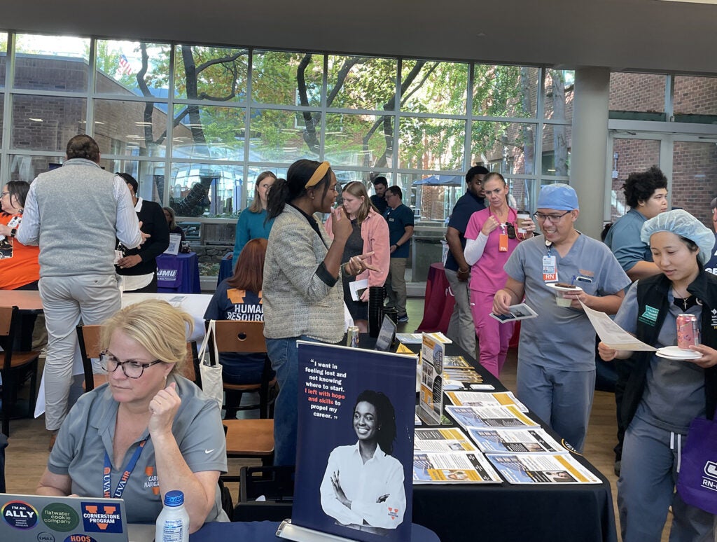 Representatives from UVA Career Navigation Center, UVA HR Benefits, and UVA Health University Medical Center’s Nursing Professional Governance Organization (NPGO) also shared information on mentorship, career coaching, application writing, nursing degree scholarships, and employee education benefits such as tuition reimbursement.