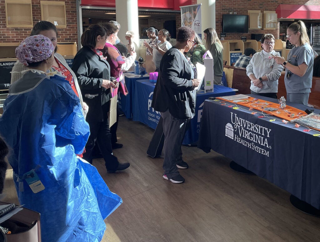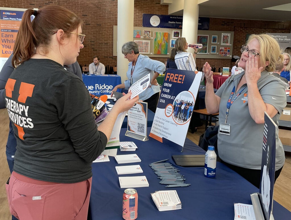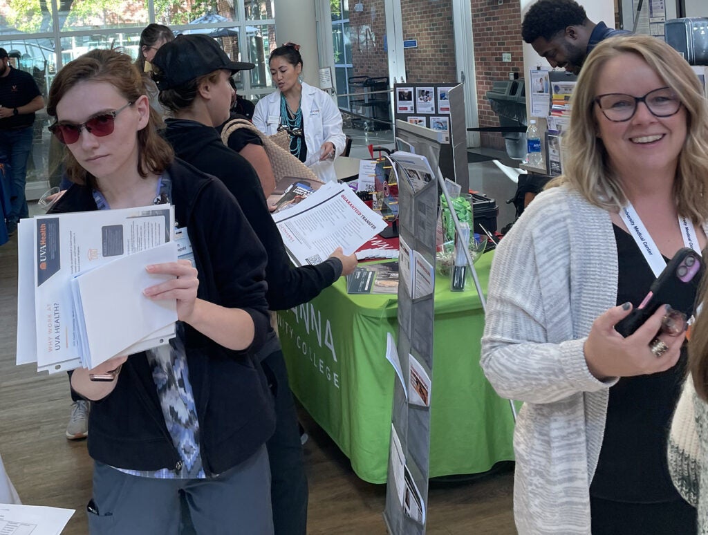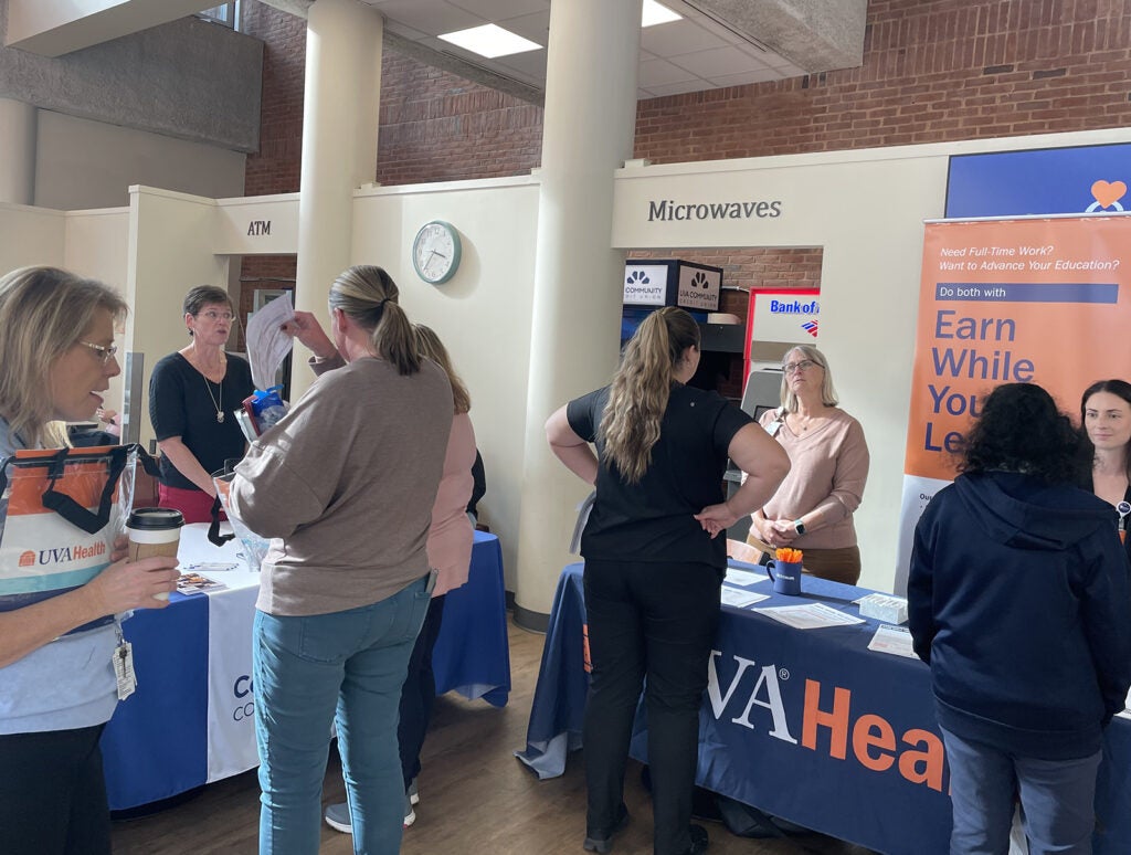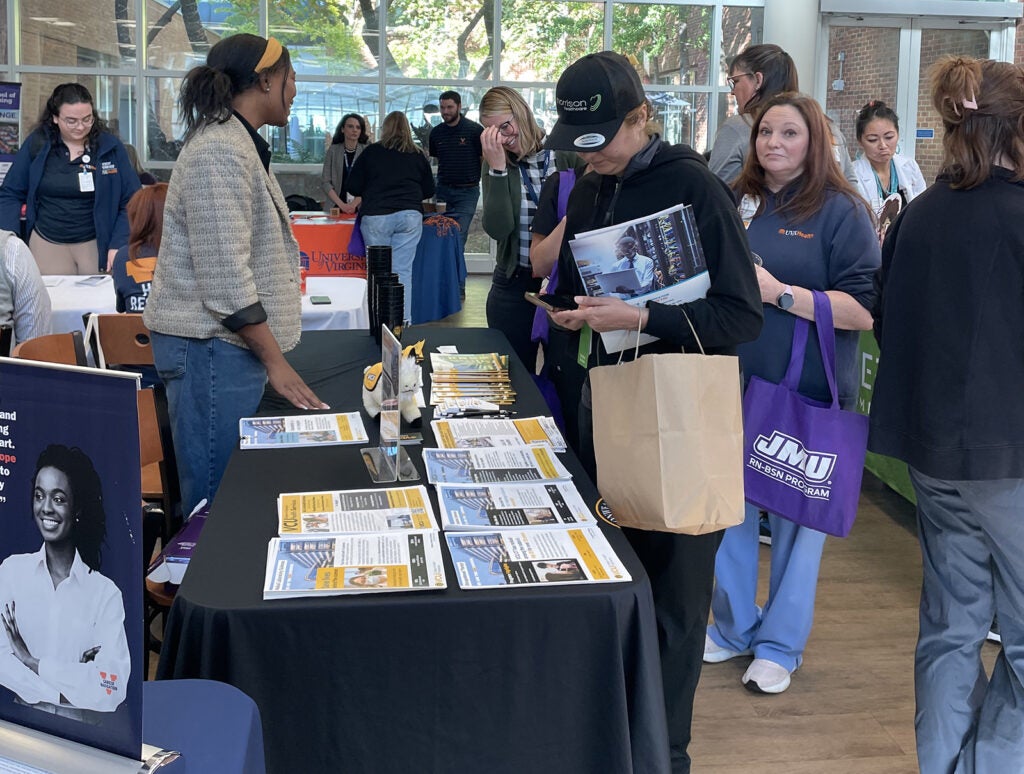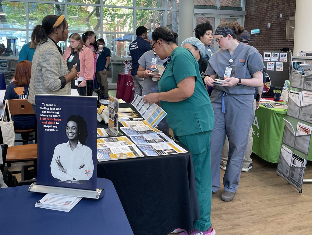 UVA Health team members met admissions counselors and other representatives for the latest information on education paths to working in a wide range of careers: access associate, athletic training, certified medical assistant, CT tech, community health, emergency medical technician (EMT), executive leadership, healthcare administration, health informatics, IR tech, LPN, nursing (ADN, BSN, MSN, DNP, CRNA), nutrition, pharmacy tech, physician assistant,medical science, patient care technician, phlebotomy/specimen management technician, physical therapy, public health sciences, radiology, rehabilitation sciences, respiratory therapy, sonography, surgical tech, social work, and sterile processing technician.