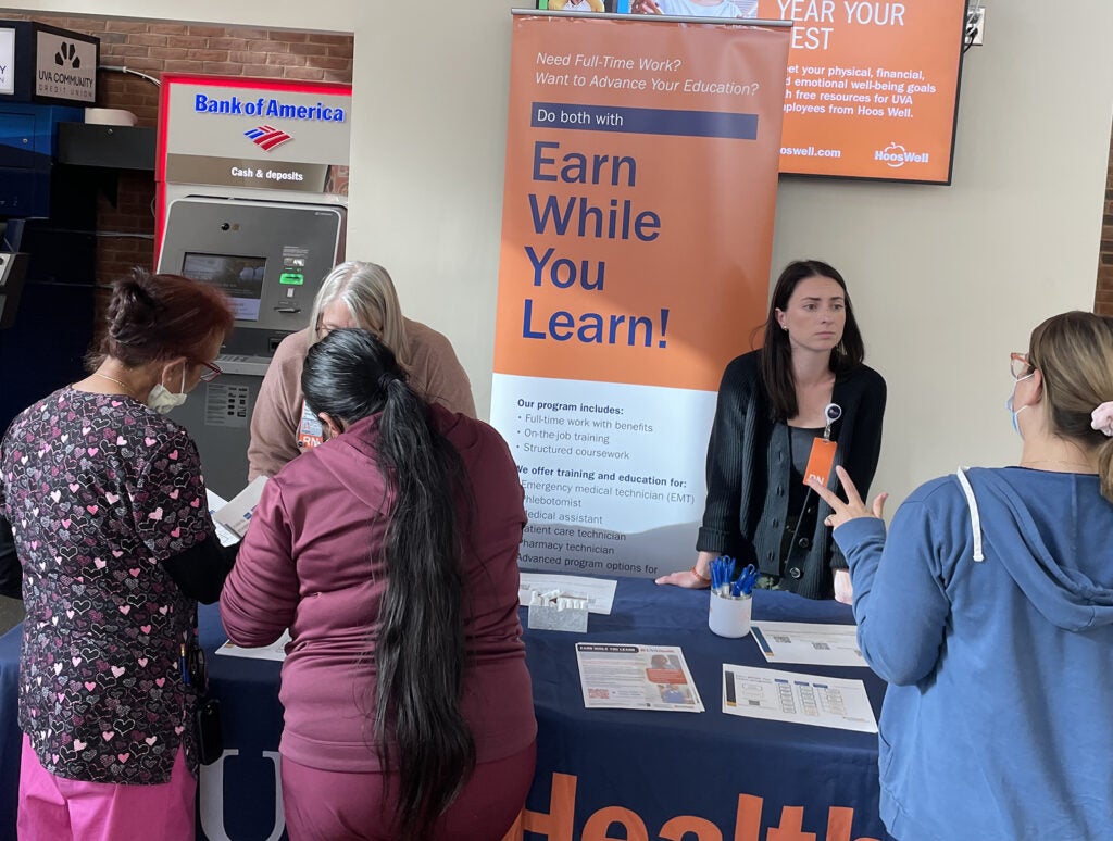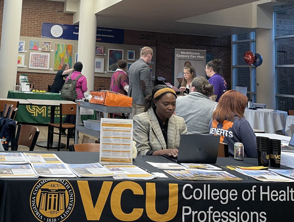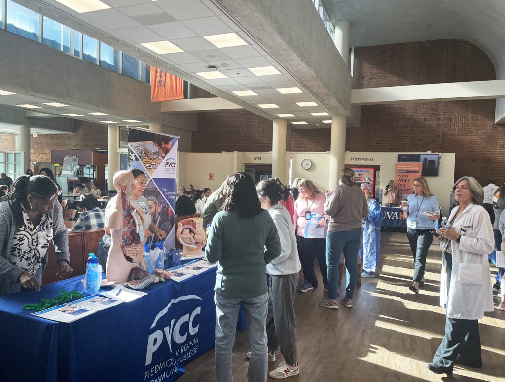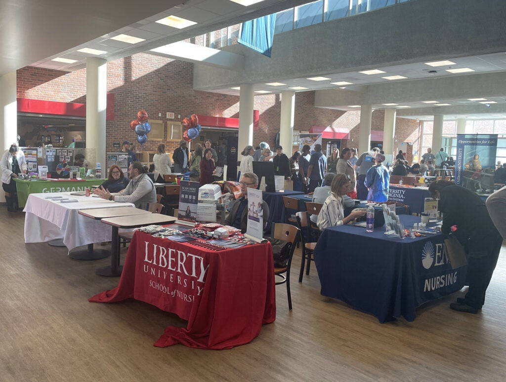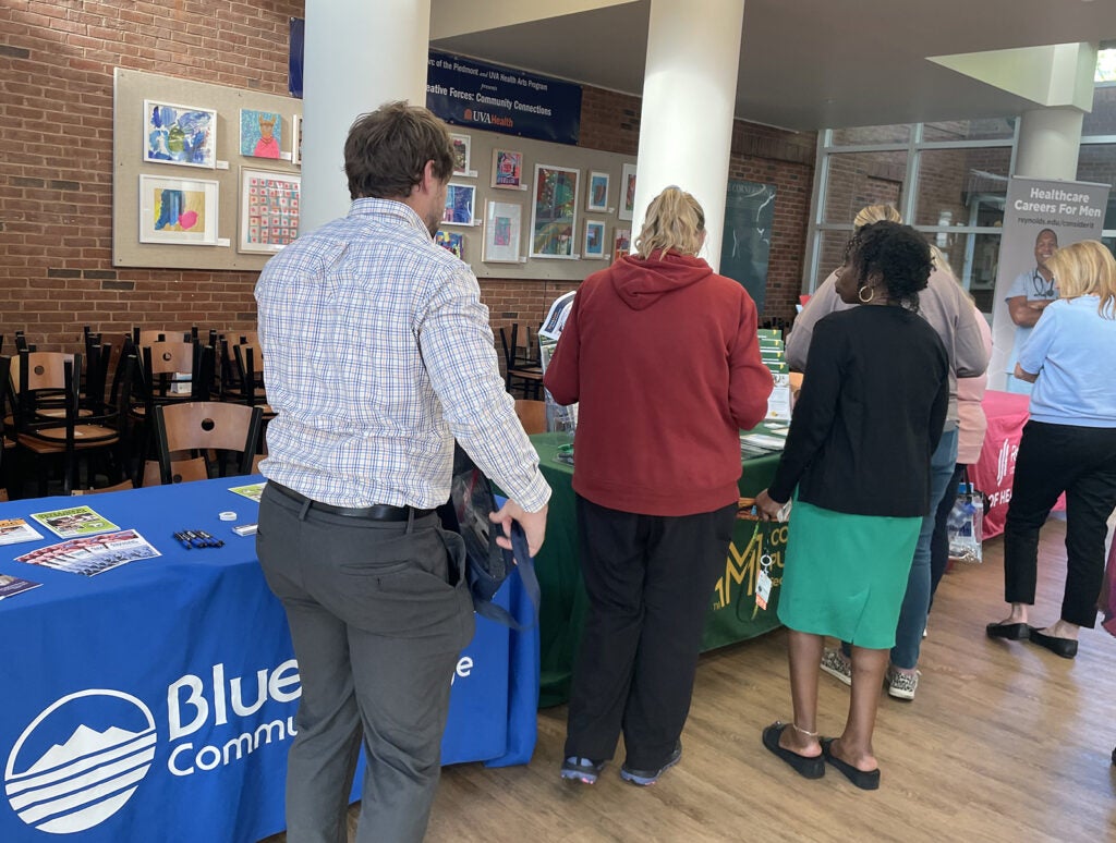 UVA Health team members met admissions counselors and other representatives for the latest information on education paths to working in a wide range of careers: access associate, athletic training, certified medical assistant, CT tech, community health, emergency medical technician (EMT), executive leadership, healthcare administration, health informatics, IR tech, LPN, nursing (ADN, BSN, MSN, DNP, CRNA), nutrition, pharmacy tech, physician assistant,medical science, patient care technician, phlebotomy/specimen management technician, physical therapy, public health sciences, radiology, rehabilitation sciences, respiratory therapy, sonography, surgical tech, social work, and sterile processing technician.