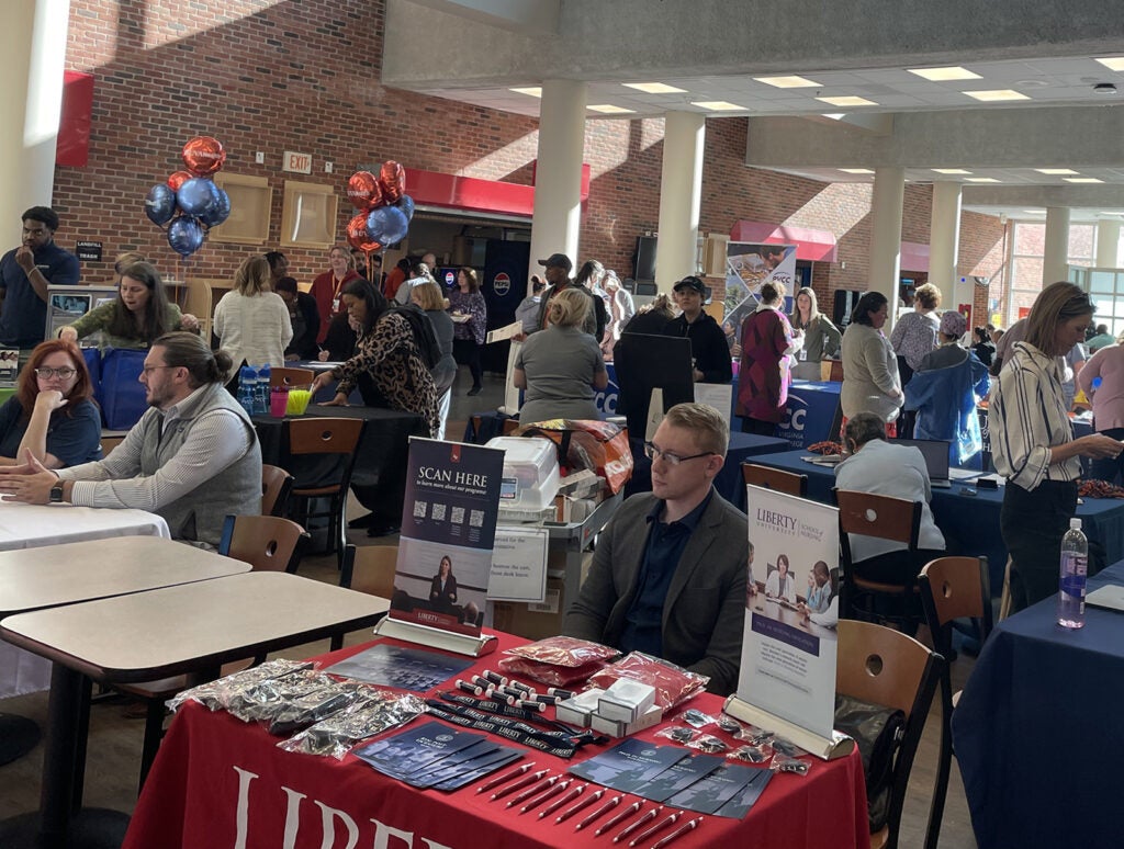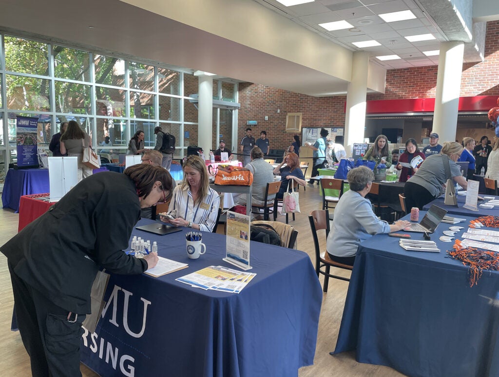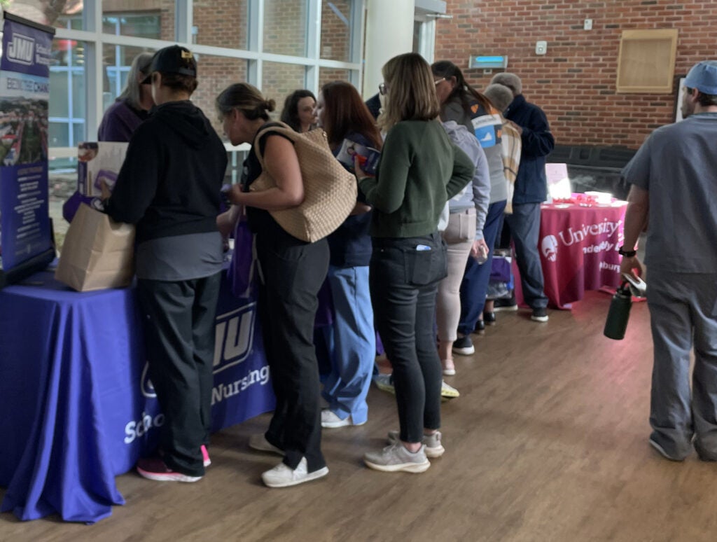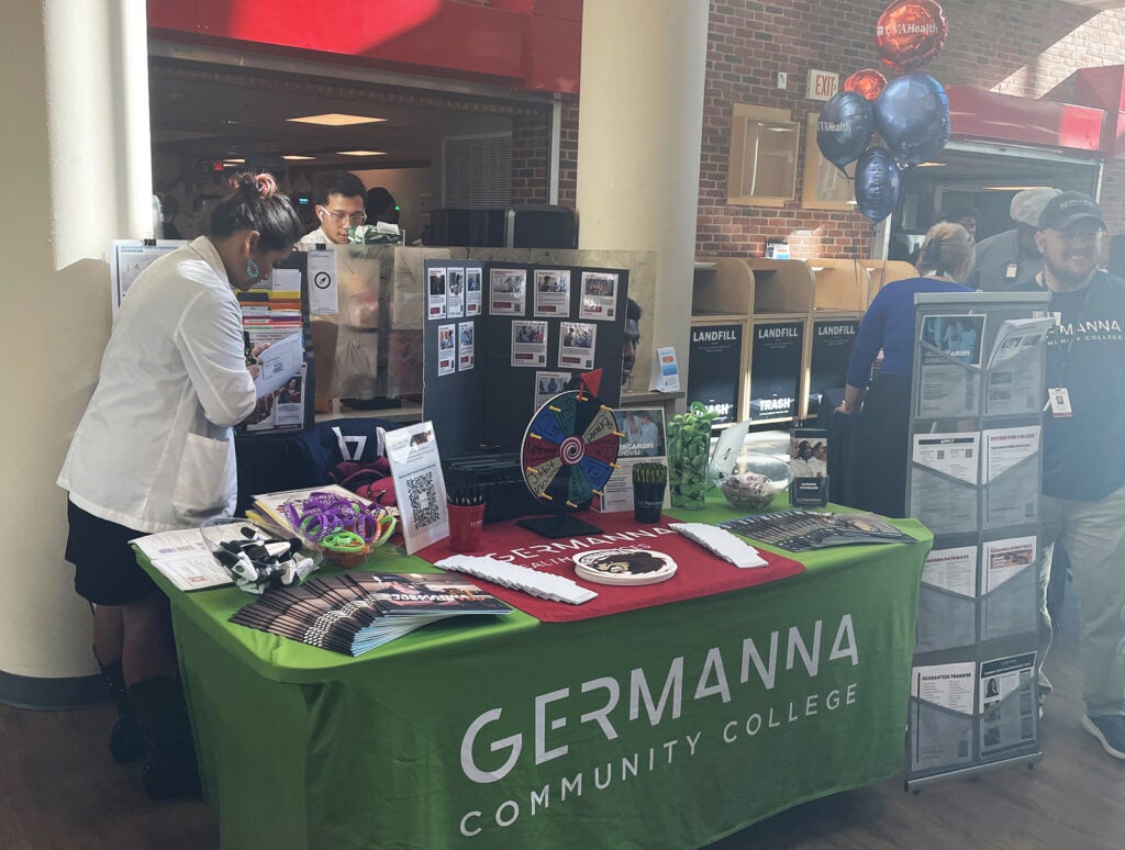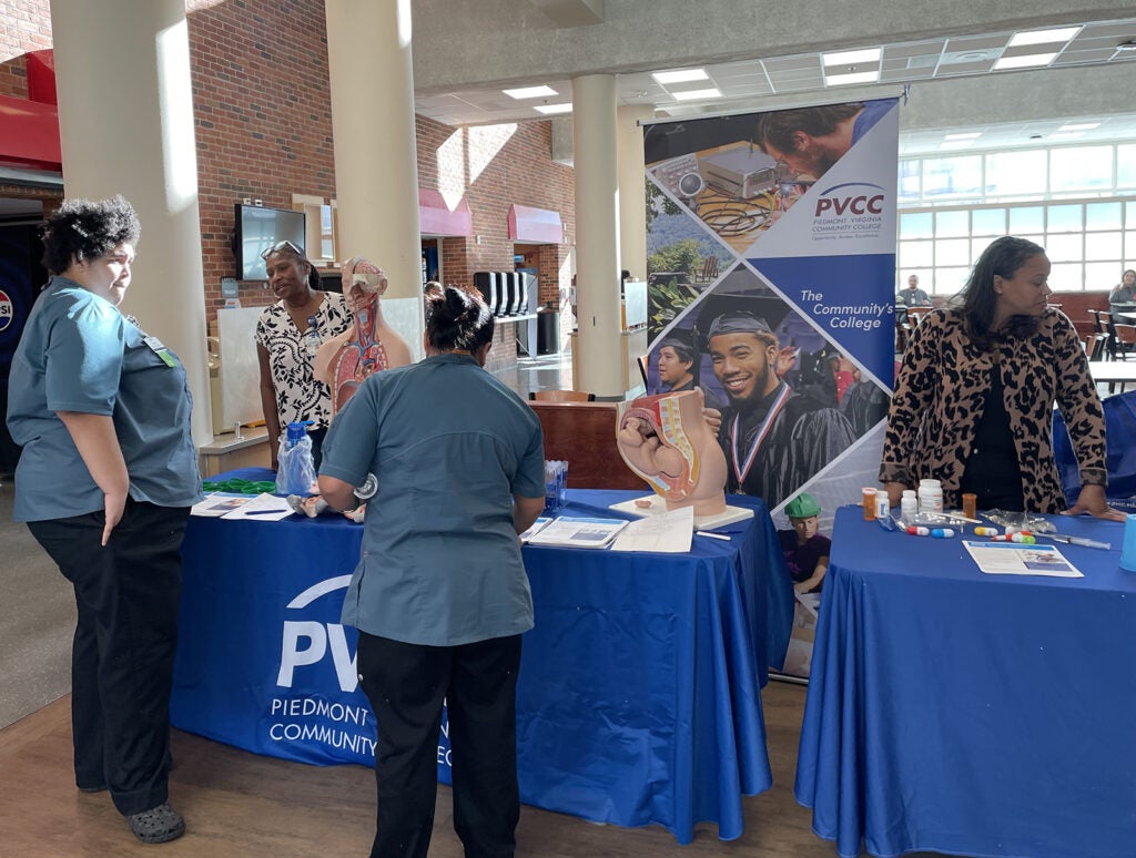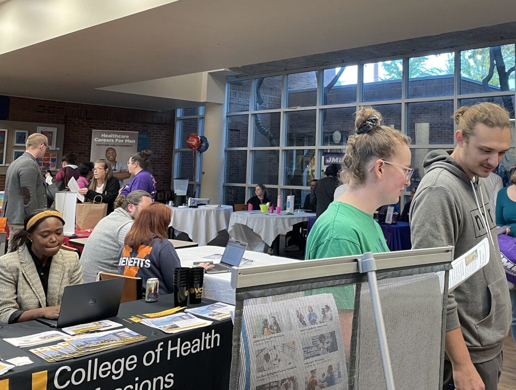 UVA Health team members met admissions counselors and other representatives for the latest information on education paths to working in a wide range of careers: access associate, athletic training, certified medical assistant, CT tech, community health, emergency medical technician (EMT), executive leadership, healthcare administration, health informatics, IR tech, LPN, nursing (ADN, BSN, MSN, DNP, CRNA), nutrition, pharmacy tech, physician assistant,medical science, patient care technician, phlebotomy/specimen management technician, physical therapy, public health sciences, radiology, rehabilitation sciences, respiratory therapy, sonography, surgical tech, social work, and sterile processing technician.