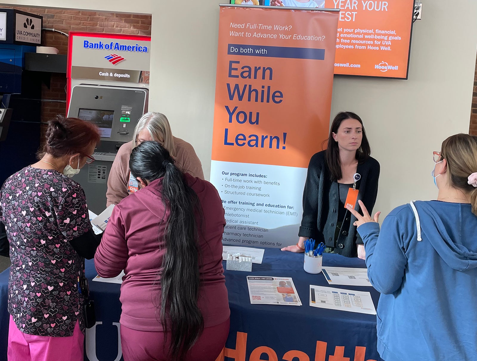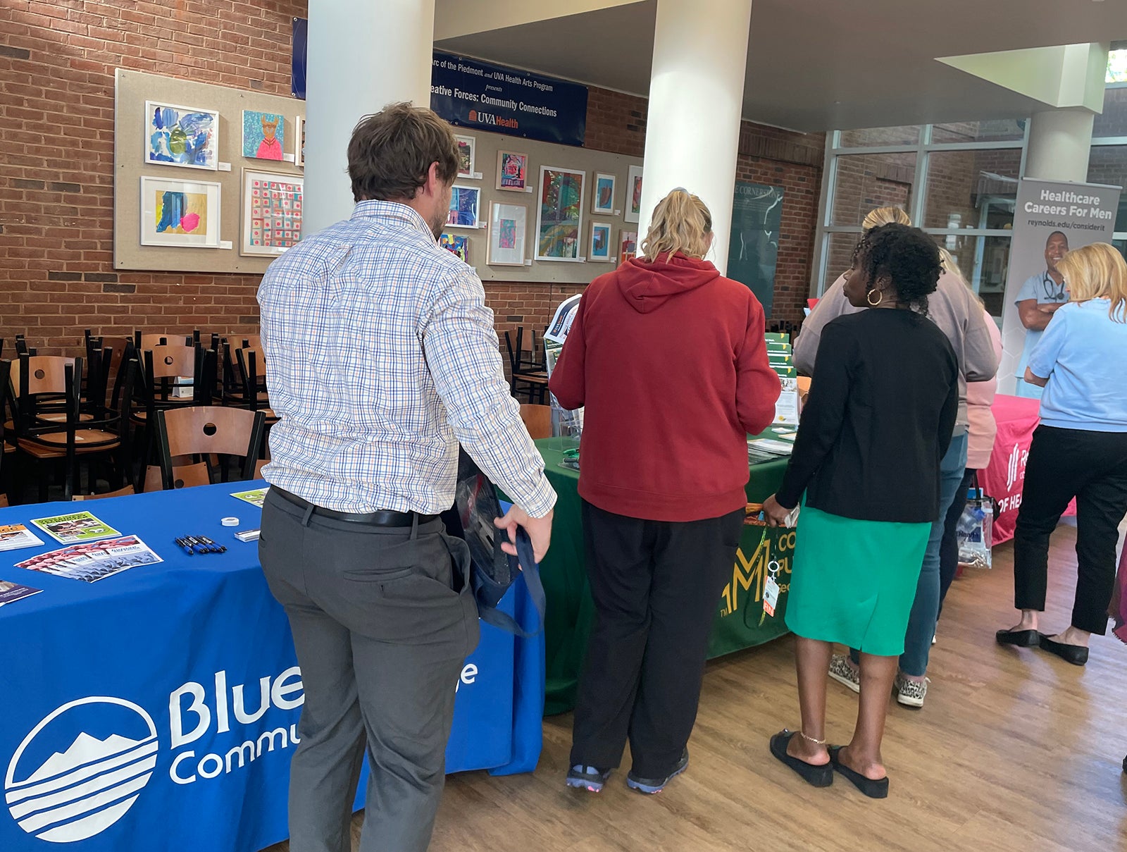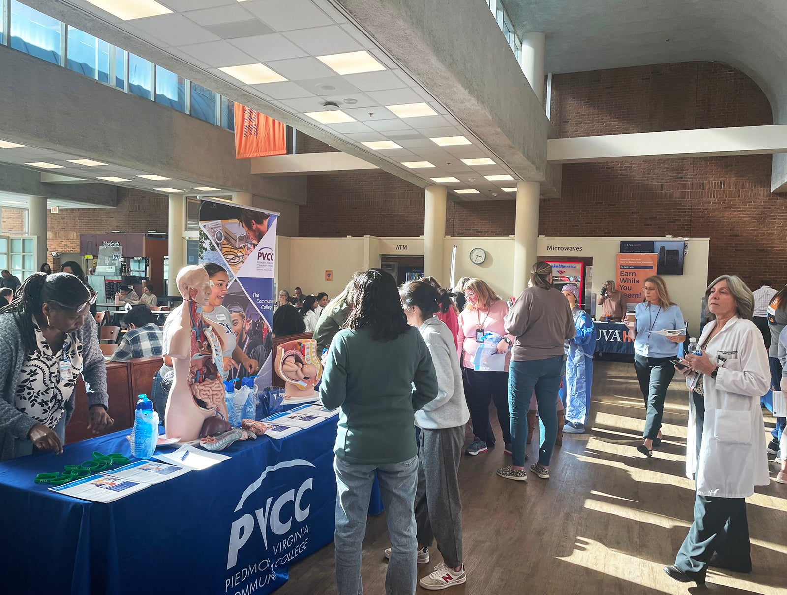 UVA Health team members met admissions counselors and other representatives for the latest information on education paths to working in a wide range of careers: access associate, athletic training, certified medical assistant, CT tech, community health, emergency medical technician (EMT), executive leadership, healthcare administration, health informatics, IR tech, LPN, nursing (ADN, BSN, MSN, DNP, CRNA), nutrition, pharmacy tech, physician assistant,medical science, patient care technician, phlebotomy/specimen management technician, physical therapy, public health sciences, radiology, rehabilitation sciences, respiratory therapy, sonography, surgical tech, social work, and sterile processing technician.