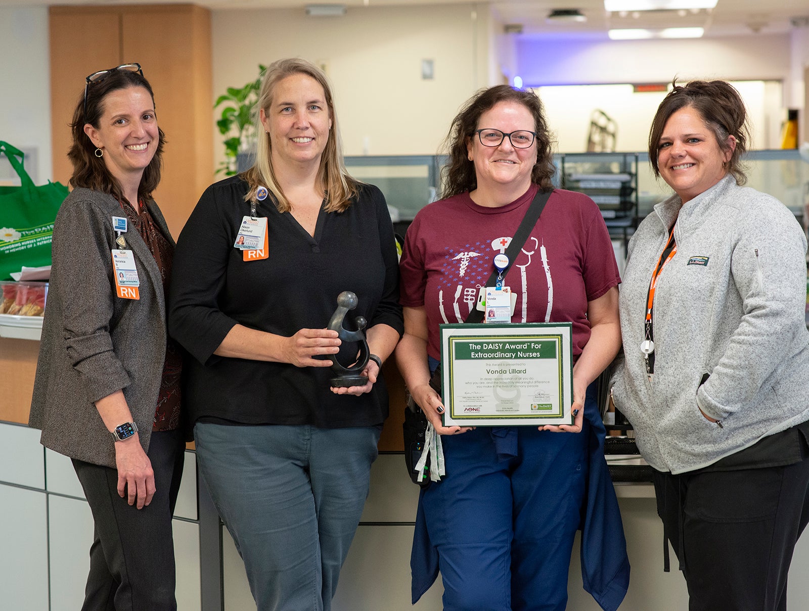 The Nursing Professional Governance Organization (NPGO) honors up to two UVA Health University Medical Center nurses each month with a DAISY Award. UVA Health University Medical Center Associate Chief Nursing Officer Veronica Brill, MSN, RN, NEA-BC, and DAISY Award Committee Vice Chair Anthony Mallory, BSN, RN, CPAN, presented Vonda Lillard, BSN, RN, 6 East, with a DAISY Award.