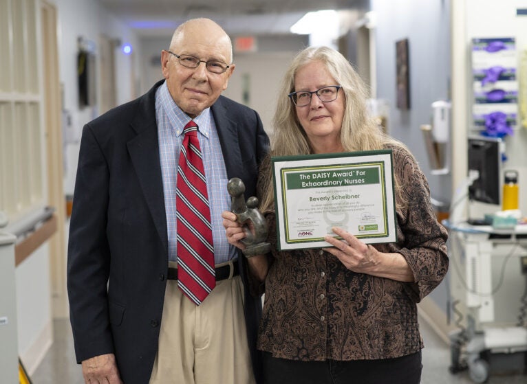 The Nursing Professional Governance Organization (NPGO) honors up to two UVA Health University Medical Center nurses each month with a DAISY Award. Associate Chief Nursing Officer Veronica Brill, RN, NEA-BC, and DAISY Award Committee Vice Chair Anthony Mallory, BSN, RN, CPAN, surprised Beverly Scheibner, RN, with the announcement.