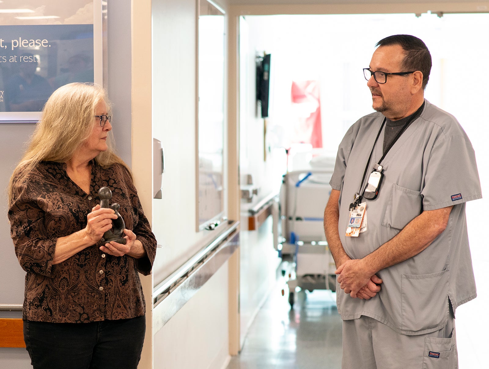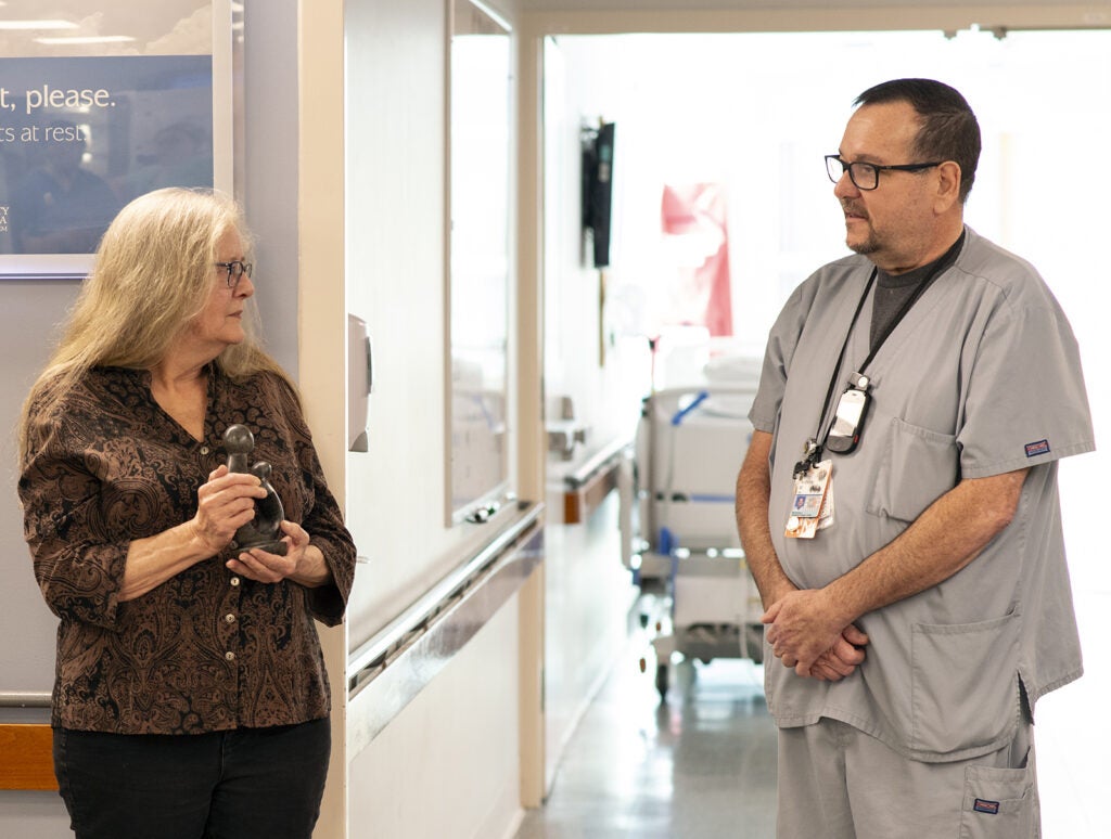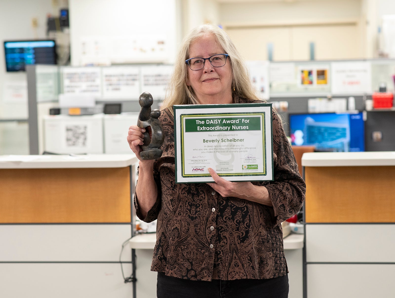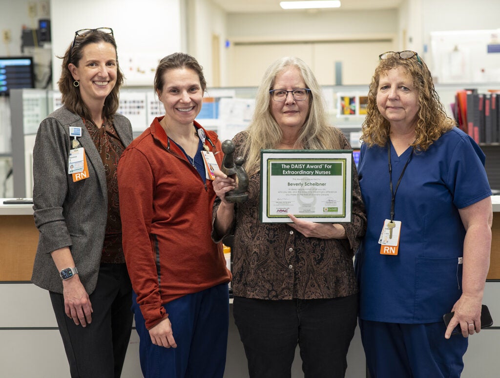 The Nursing Professional Governance Organization (NPGO) honors up to two UVA Health University Medical Center nurses each month with a DAISY Award. Associate Chief Nursing Officer Veronica Brill, RN, NEA-BC, and DAISY Award Committee Vice Chair Anthony Mallory, BSN, RN, CPAN, surprised Beverly Scheibner, RN, with the announcement.