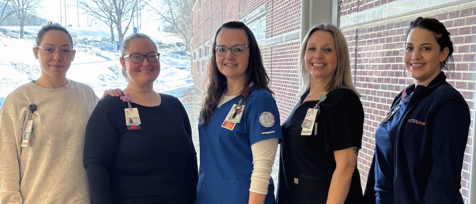 UVA Health Earn While You Learn RN Program | From left, front row: Kaylah Holsapple, Ashlyn Hughes, and Caitlin Payne. From left, top row: Nicole Maupin and Sarah Jinkins. (Not pictured: Ahyana Calloway, Shelby Clements, Riley Dobmeier, Kristen Hatley, Ashlynn Dinsmore, Andrea Jovel, Julia Mix, Kathleen Morris, Kamden Pleasants, Erin Reres, and Amber Valadez.)