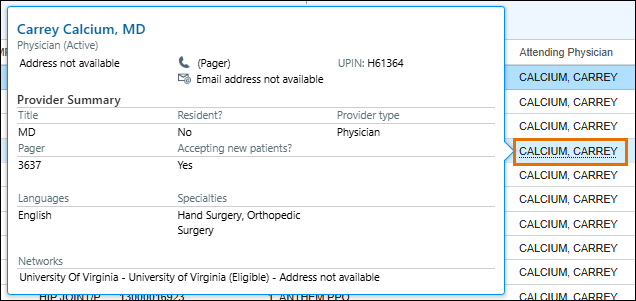 - Hover bubbles display helpful details, such as provider demographics, in select columns.