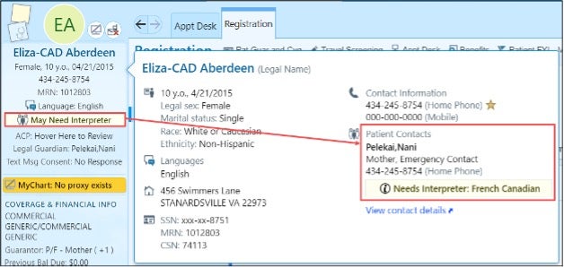 2. Storyboard Identifies Patient Contacts That “May Need Interpreter” Storyboard is a panel appearing on the left-hand side of team members screens that provides a summary of a patient’s key chart information. With this update, team members can hover over the “May Need Interpreter” banner in Storyboard to easily identify pediatric patients whose parents or guardians might need language support.
