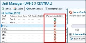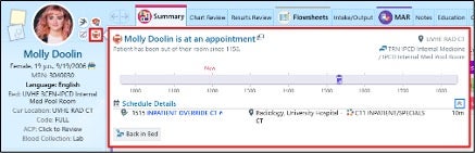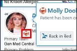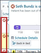 Team members can quickly check to see if a hospital patient is available using a new icon. Hover over the icon for details about the patient's current location, timeline, upcoming schedule, and orders that may affect the patient's schedule. Click on the Back in Bed button to quickly indicate that the patient is back in their room.