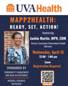 Wednesday, April, 15 | noon-1 p.m. | Zoom | Registration required to receive Zoom link | UVA School of Medicine Office of Medical Sciences Outreach, and UVA Health Office of Community Engagement and Health Outcomes, host an informational webinar session on the 2025 MAPP2Health Report, featuring Jackie Martin, MPH, CDM, Director, Community Partnerships and Health Outcomes. Join this webinar to learn about the history of MAPP2Health, current top health priorities, and how to support the Community Health Improvement Plan (CHIP).