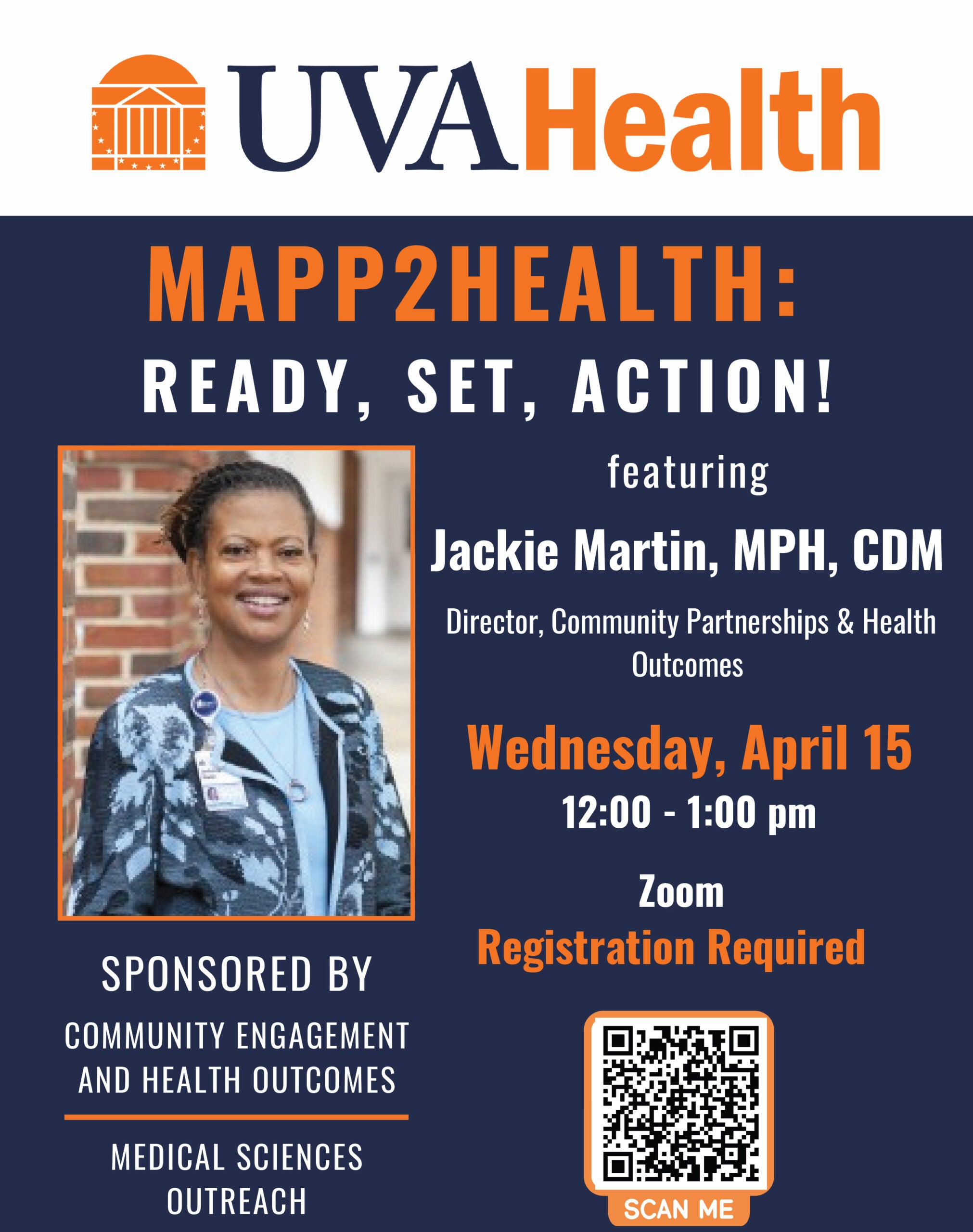 Wednesday, April, 15 | noon-1 p.m. | Zoom | Registration required to receive Zoom link | UVA School of Medicine Office of Medical Sciences Outreach, and UVA Health Office of Community Engagement and Health Outcomes, host an informational webinar session on the 2025 MAPP2Health Report, featuring Jackie Martin, MPH, CDM, Director, Community Partnerships and Health Outcomes. Join this webinar to learn about the history of MAPP2Health, current top health priorities, and how to support the Community Health Improvement Plan (CHIP).