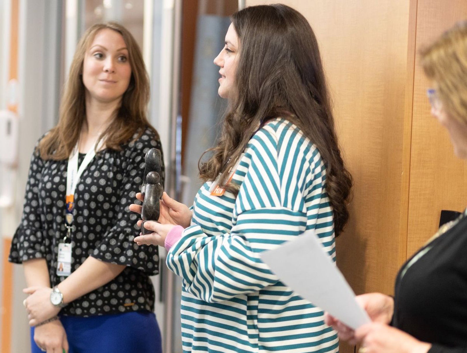 Now, Carr is being honored for her calm, gentle presence. UVA Health University Medical Center Director of Nursing Business Operations Kathryn King Perkinson, MSN, RN, NEA-BC, CEN, and Nursing Professional Governance Organization (NPGO) DAISY Award Committee Chair Caitlin Lowman, BSN, RN, CCRN, surprised Carr with a DAISY Award!