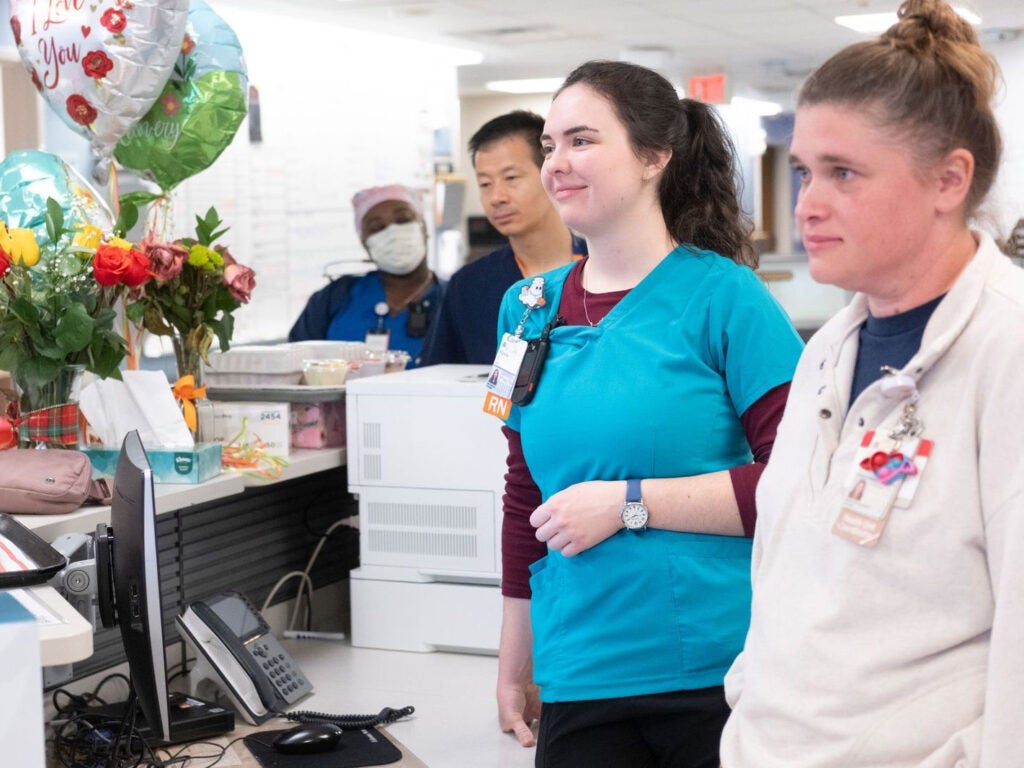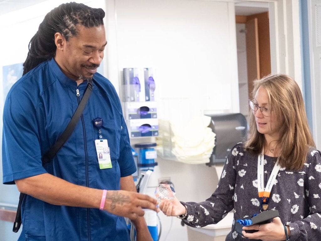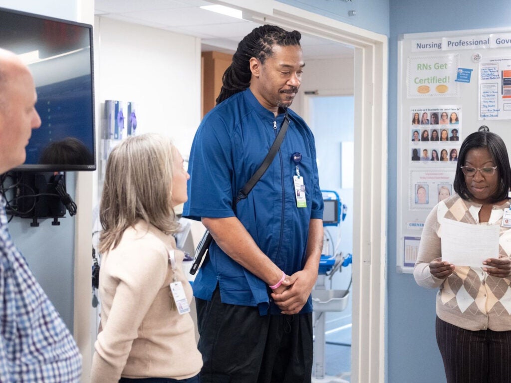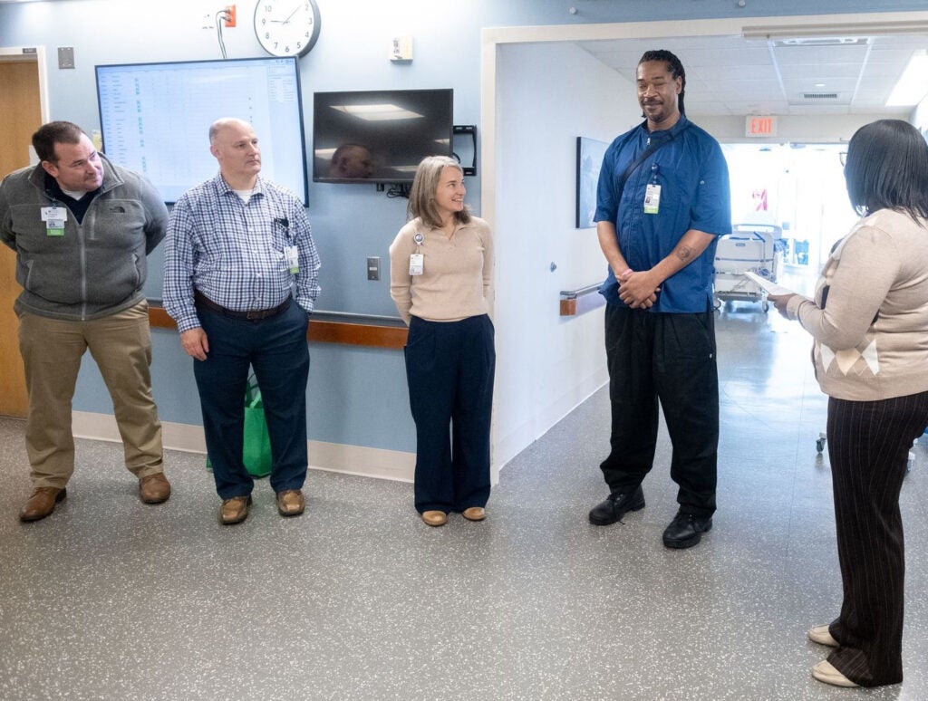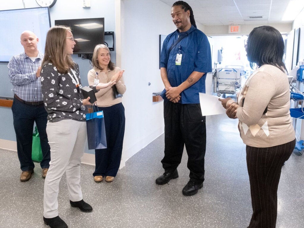 Sara Fowler, BHS, PMP, Chief of Staff to the UVA Health University Medical Center Chief Operating Officer; Shenia Thompson, MBA, MHA, Administrator, UVA Health University Medical Center Hospitality and Support Services; and Jenny Ernest, Nursing Governance Coordinator, Nursing Professional Governance Office, surprised Anthony Williams, Food and Nutritional Services (FNS), with a BEE (Being Excellent Everyday) Award.