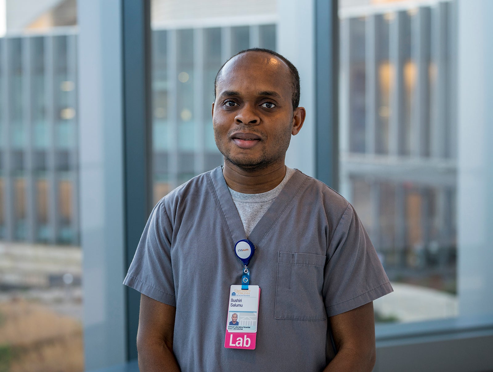 Today, Salumu works as a Clinical Laboratory Scientist 1 (CLS1) in the Core Lab, performing high-complexity diagnostic testing in chemistry and hematology. In addition to his own incredible dedication in the face of adversity, he says that the support he received from the Medical Laboratories Education Program and his colleagues in the lab were key to his success.