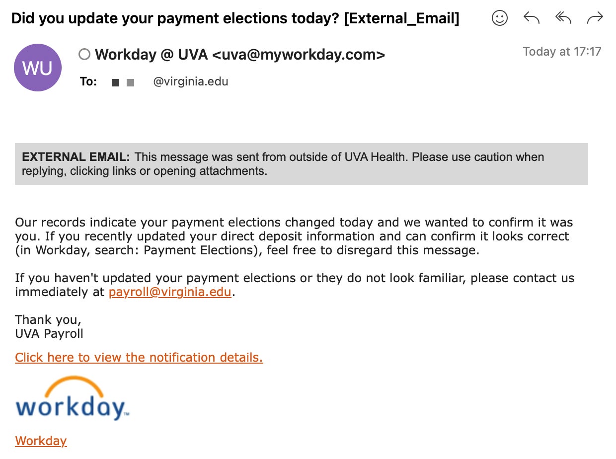 - Instead, go directly to the official UVA Health Workday portal or contact UVA Health HR to verify the legitimacy of the message.
