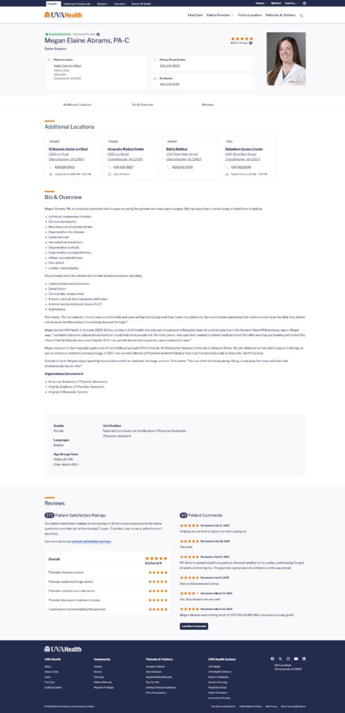 - The ability of UVA School of Medicine clinical departments, UPG Clinical Practice Group, and UVA Community Health to directly update key data in the provider profiles. This helps ensure quicker updates and greater accuracy, which is good for patients and providers alike.
