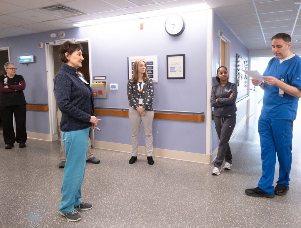 The Nursing Professional Governance Organization (NPGO) honors up to two UVA Health University Medical Center nurses each month with a DAISY Award. Bill Lombardi, DNP, AG-ACNP, Administrator, UVA Health Center for Advanced Practice (CAP), and Anthony Mallory, BSN, RN, CPAN, DAISY Award Committee Vice Chair, surprised Deborah Baker, MSN, ACNP, with a DAISY Award.