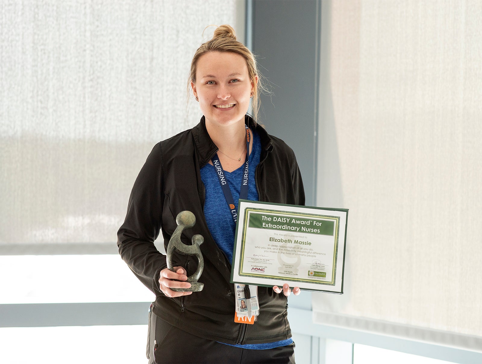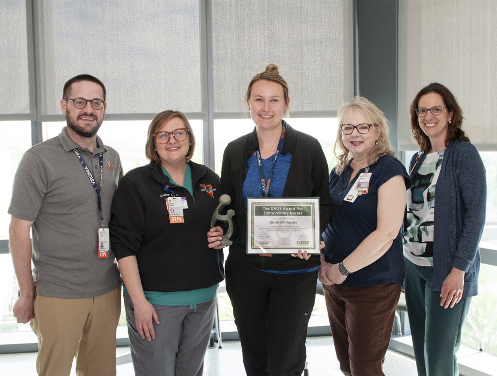 The Nursing Professional Governance Organization (NPGO) honors up to two UVA Health University Medical Center nurses each month with a DAISY Award. For reflecting "the very highest standards of nursing practice" — Elizabeth Massie, BSN, RN, CCRN, has been honored with a DAISY Award.