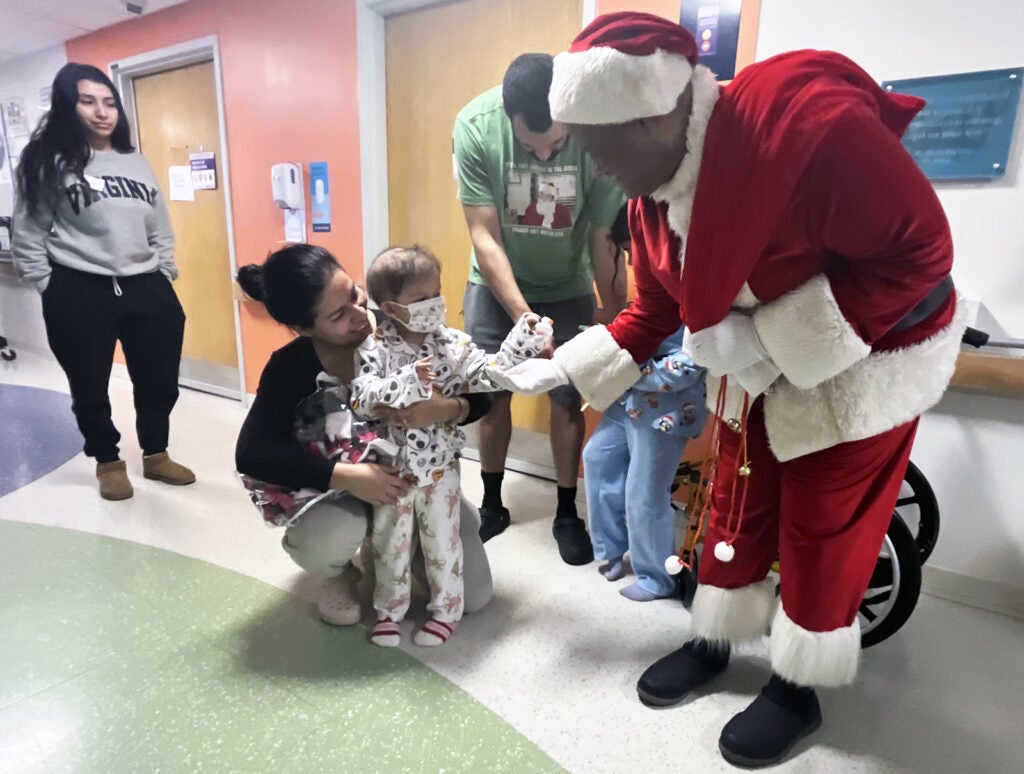 Santa Claus, aka Charlottesville Mayor Juandiego Wade, has been making these rounds for about eight years. He's been accompanied by his daughter, Gabriella Wade, most of those years. And this year, more elves to help spread the cheer: UVA Health CEO Mitch Rosner, MD, MACP, FRCP, his wife, UVA Health’s Michelle Rosner, CRNA, MSN, RN, and their children; along with Kyle Niehoff, a UVA Health volunteer who works at UVA Darden School of Business.