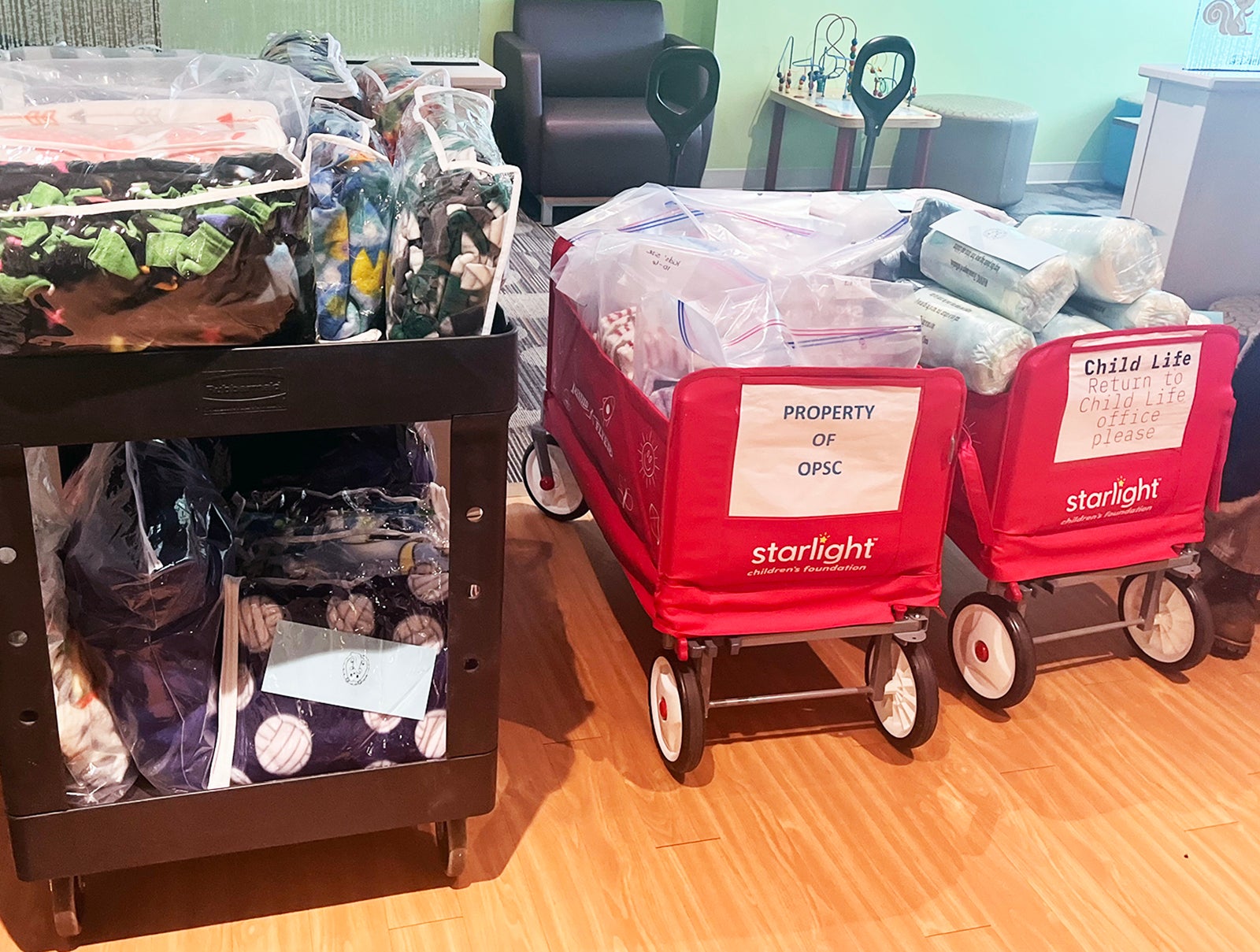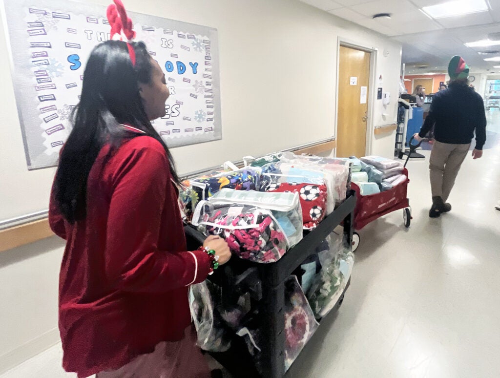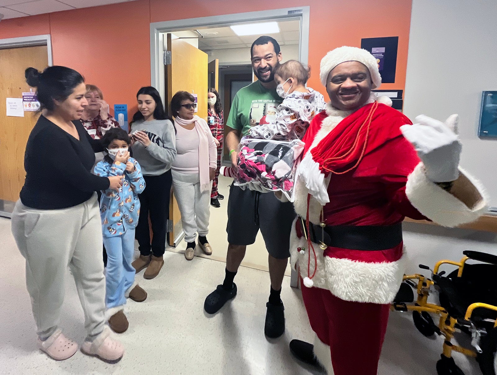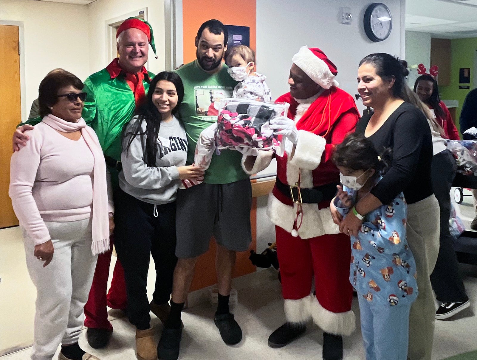 The children were nestled all snug in their beds, when they were surprised by these special visitors — bringing fun toys and games, and cozy socks. The gifts included warm, new blankets donated by a former patient, who raises money each year for the cause.