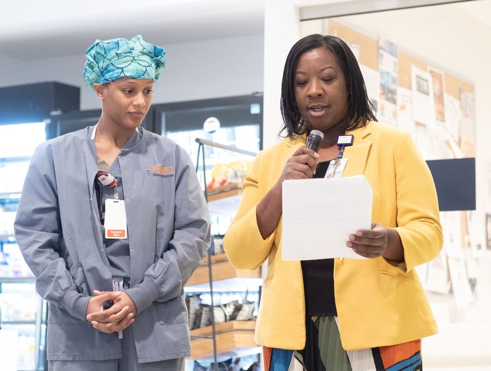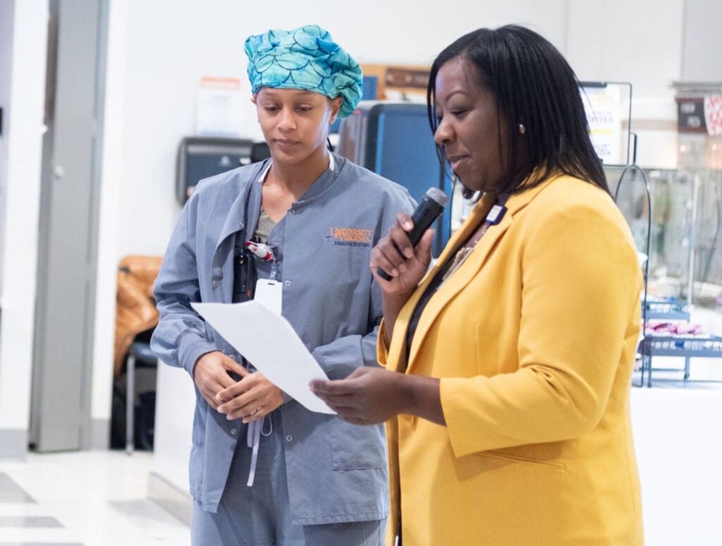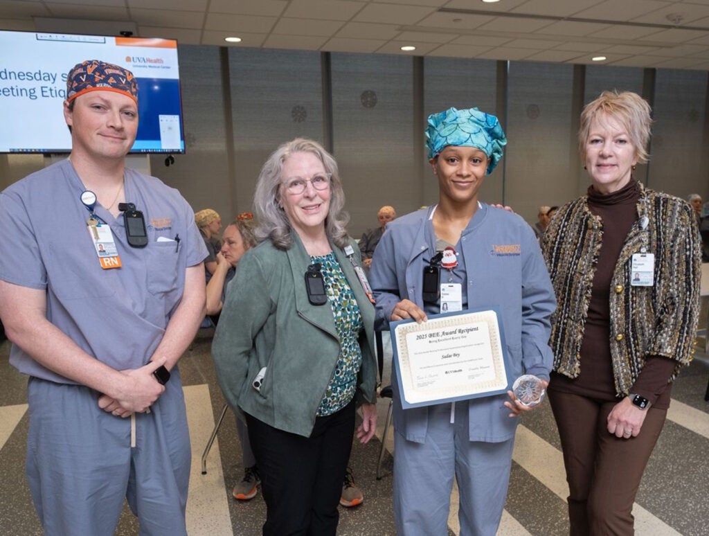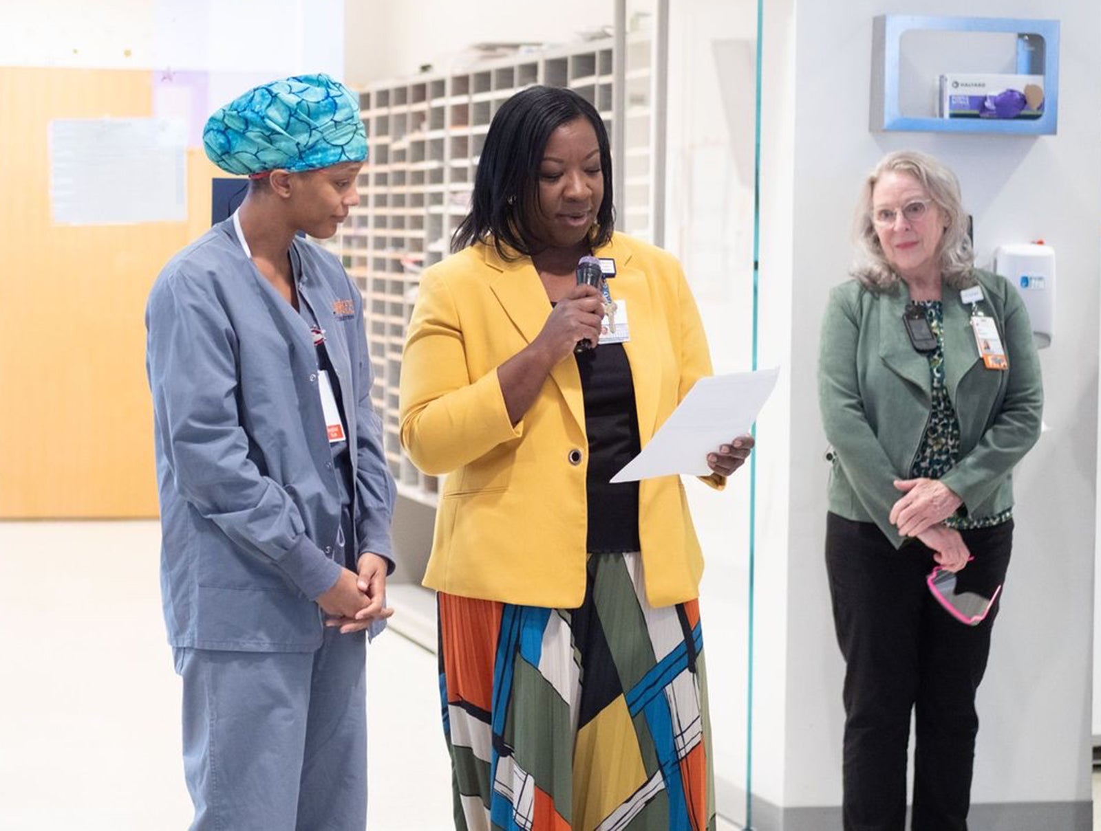 UVA Health University Medical Center Hospitality and Support Service Administrator Shenia Thompson and BEE Award Committee Chair Allisha Shifflett surprised Sadae Bey, CST, Surgical Technologist, Operating Room (OR), with a BEE (Being Excellent Everyday) Award.