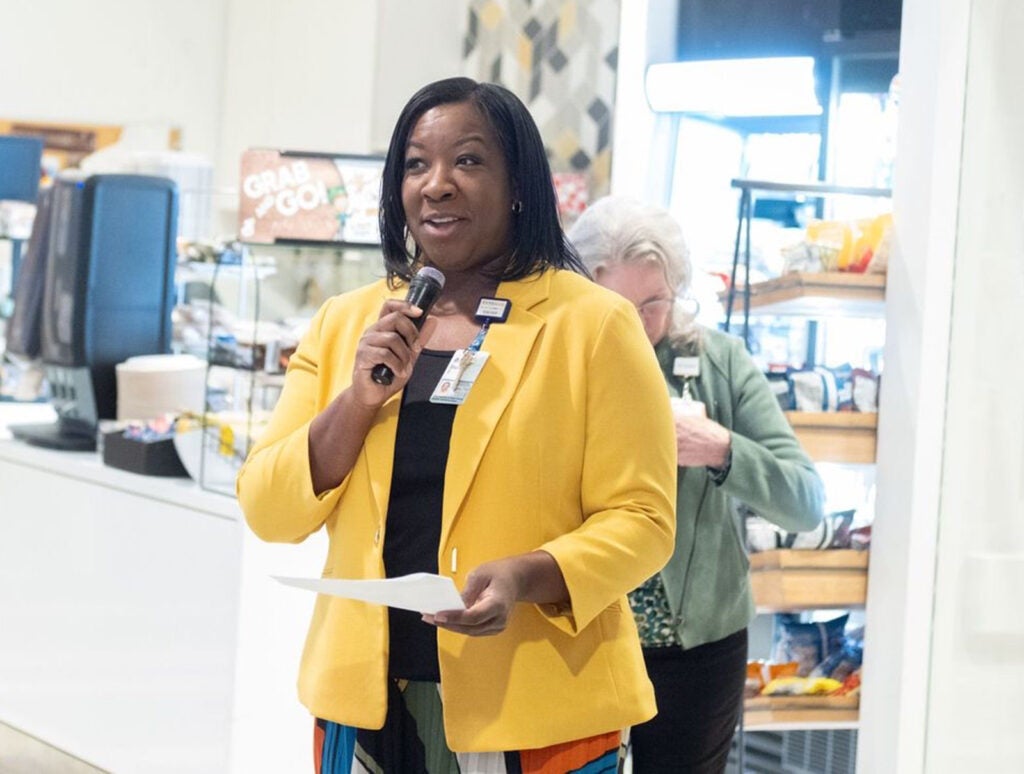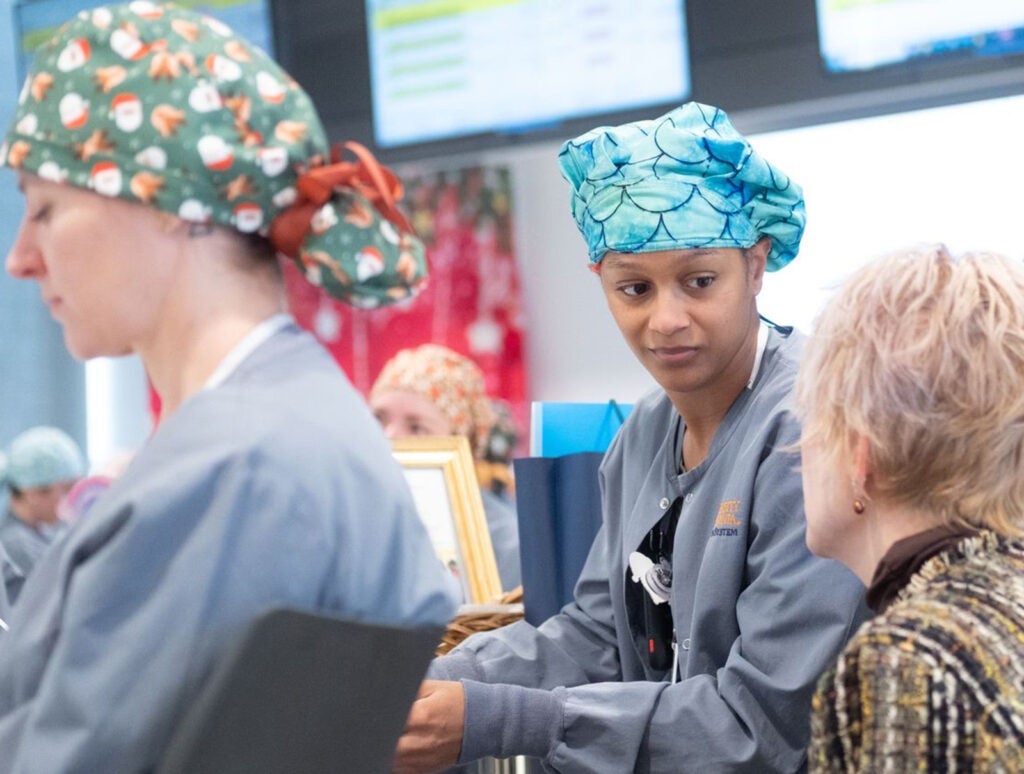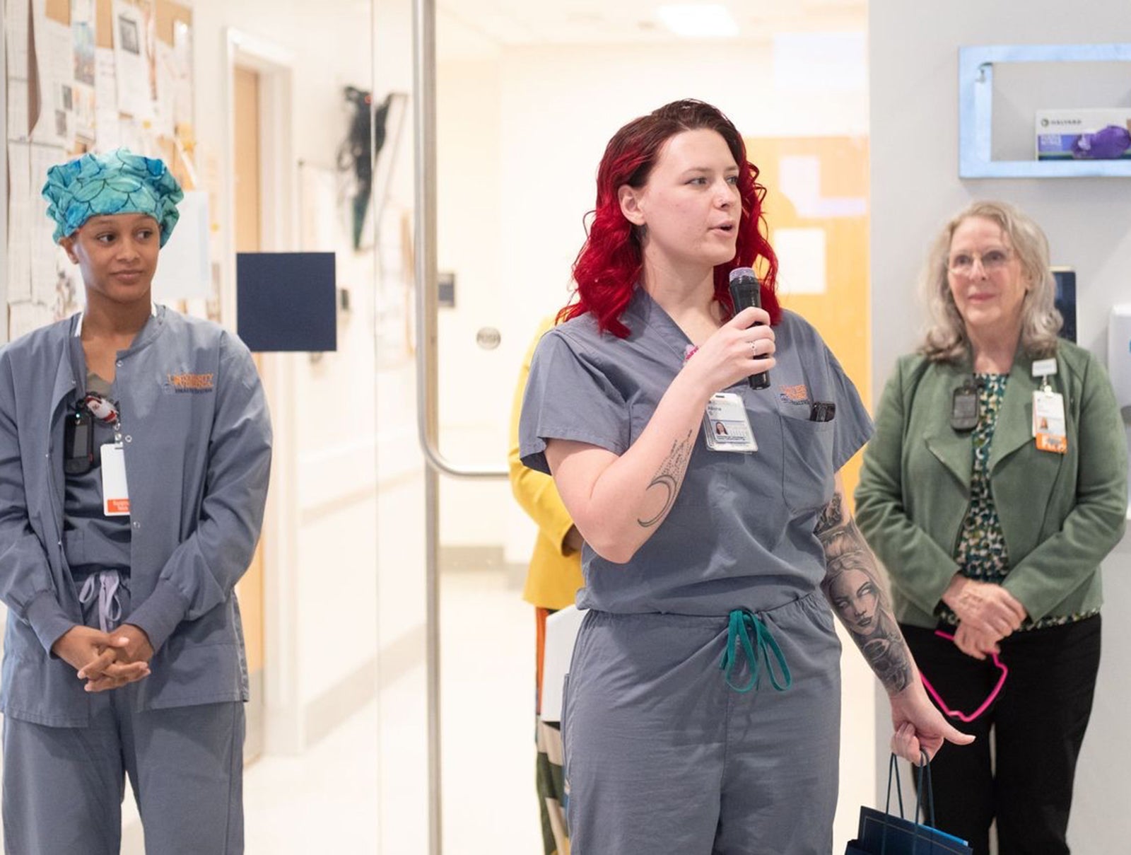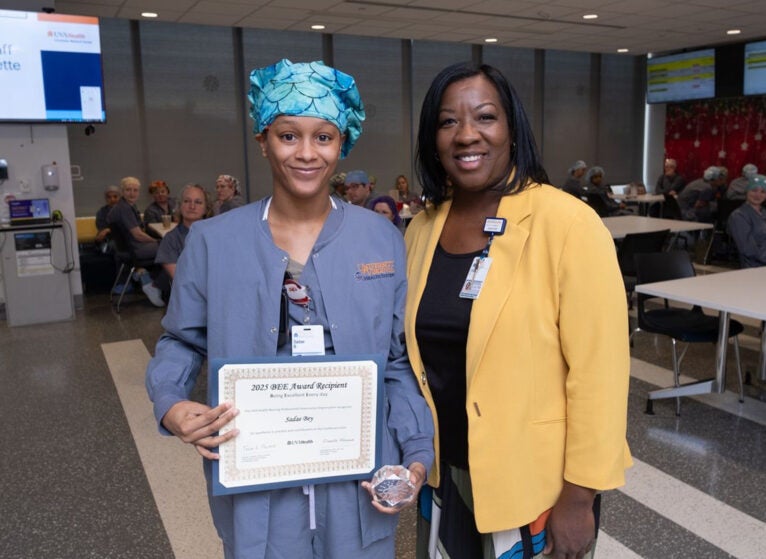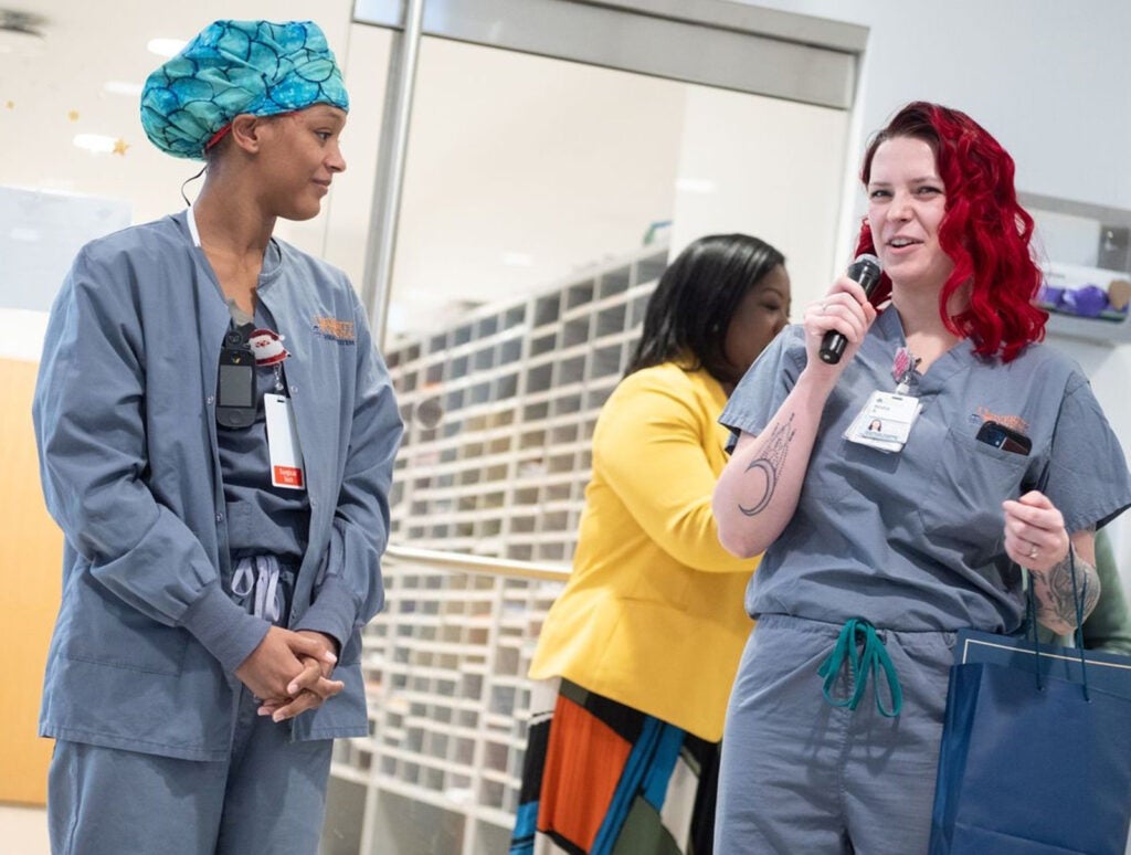 UVA Health University Medical Center Hospitality and Support Service Administrator Shenia Thompson and BEE Award Committee Chair Allisha Shifflett surprised Sadae Bey, CST, Surgical Technologist, Operating Room (OR), with a BEE (Being Excellent Everyday) Award.