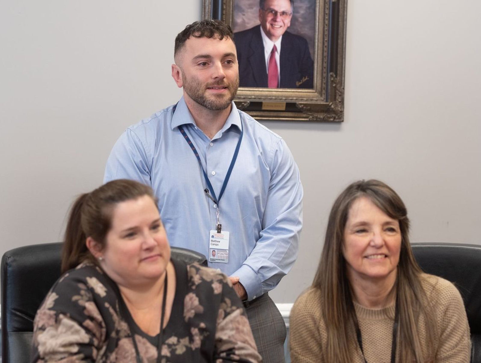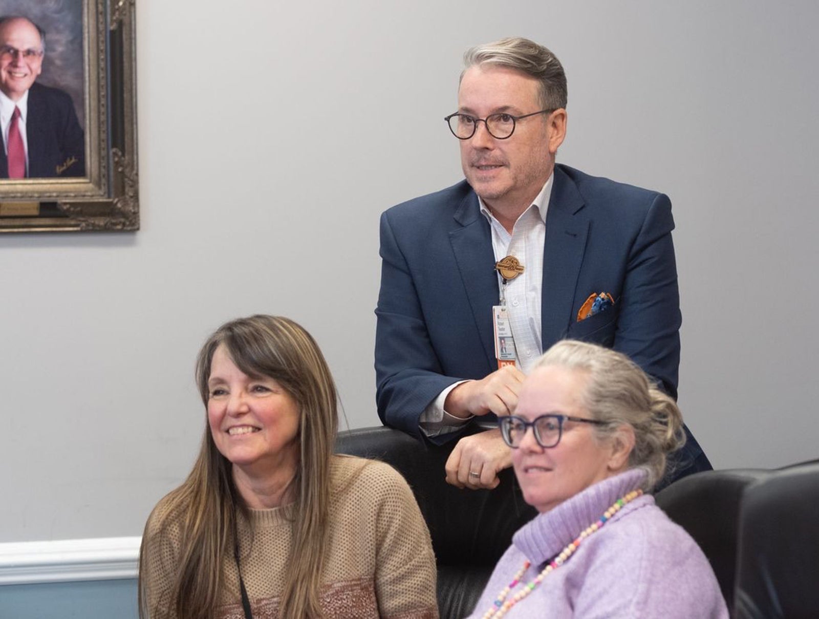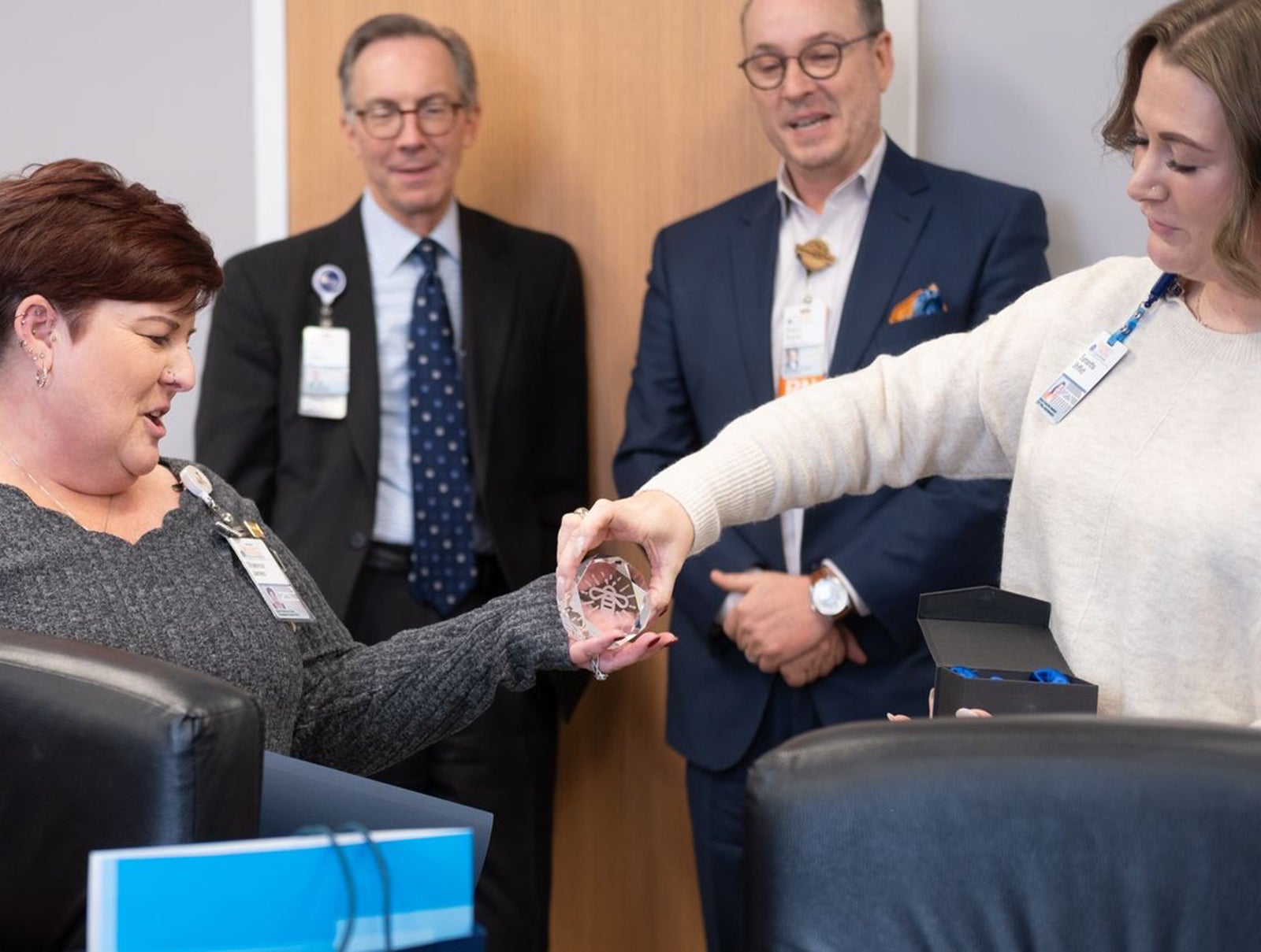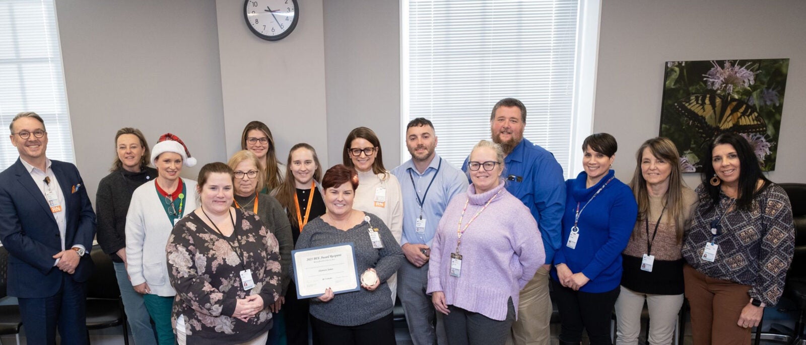 UVA Health University Medical Center Chief Medical Officer Reid Adams, MD, and BEE Committee Chair Samantha Shifflett surprised Shannon James, Transplant Scheduling POD, with a BEE (Being Excellent Everyday) Award.